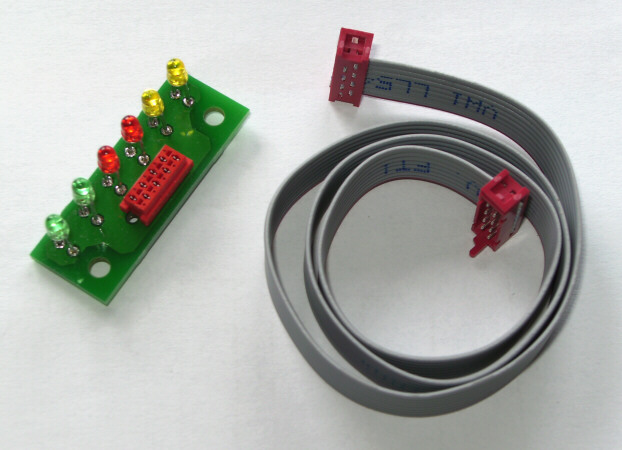 Externe LED-Platine mit 40cm Flachbandkabel zum anzeigen des Status' der Interfaceplatine (BRKOUT7) oder der TripleBeast Schrittmotorsteuerung. Die Platine kann mit Abstandsbolzen an einer Fontplatte montiert werden. Dadurch sind die Status-LEDs auch bei geschlossenem Gehäuse sichtbar.
