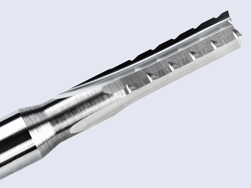 Fräser zum Fräsen von Kunststoffen, Schäumen, Holz und Holzwerkstoffen, speziell Sperrholz. Gerader Stirnanschliff, dadurch saubere Oberfläche auch am Boden der Fräsnut.